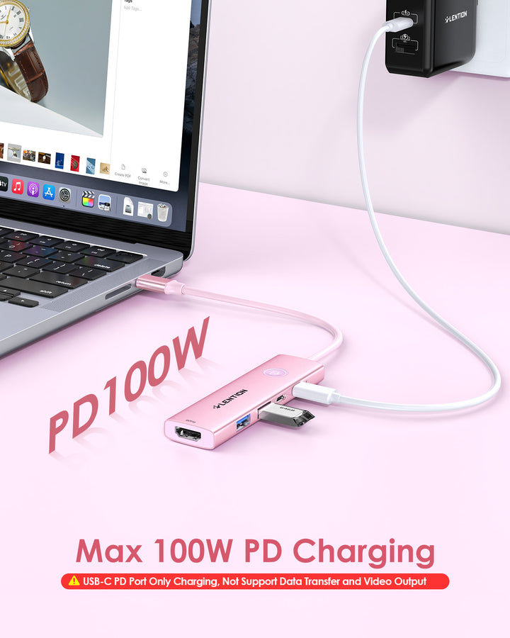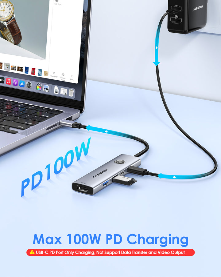 · 𝐌𝐚𝐱 𝐏𝐨𝐰𝐞𝐫𝐟𝐮𝐥 𝟏𝟎𝟎𝐖 𝐏𝐃 𝐂𝐡𝐚𝐫𝐠𝐢𝐧𝐠: The USB C multiport adapter features Type C fast charge PD port to provide up to 100W of high-speed charging for laptops. Get your USB C devices charged, Don’t worry about the power while using the other functions. 𝐍𝐎𝐓𝐄: 𝐓𝐡𝐞 𝐔𝐒𝐁-𝐂 𝐩𝐨𝐫𝐭 𝐬𝐮𝐩𝐩𝐨𝐫𝐭𝐬 𝐏𝐃 𝐜𝐡𝐚𝐫𝐠𝐢𝐧𝐠 𝐨𝐧𝐥𝐲; 𝐢𝐭 𝐝𝐨𝐞𝐬 𝐧𝐨𝐭 𝐬𝐮𝐩𝐩𝐨𝐫𝐭 𝐝𝐚𝐭𝐚 𝐭𝐫𝐚𝐧𝐬𝐦𝐢𝐬𝐬𝐢𝐨𝐧 𝐨𝐫 𝐯𝐢𝐝𝐞𝐨 𝐬𝐢𝐠𝐧𝐥𝐬.