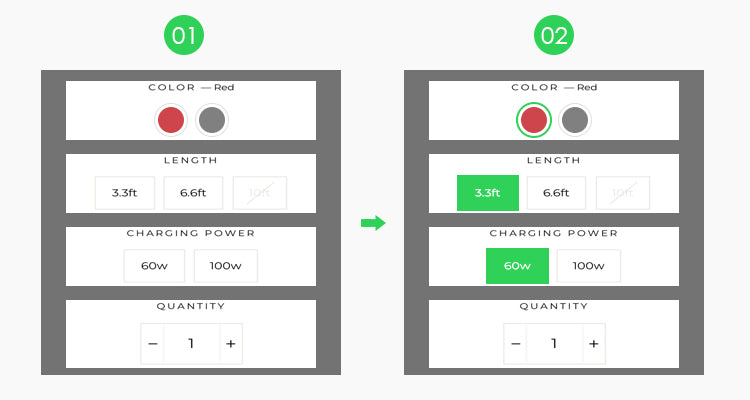 Select the option, length, charging power, color or quantity if necessary, and Click on "ADD TO CART" or "BUY IT NOW".