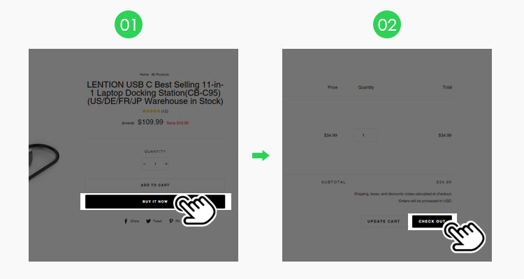 ①Click "BUY IT NOW" on product page or "CHECK OUT" in your cart.
